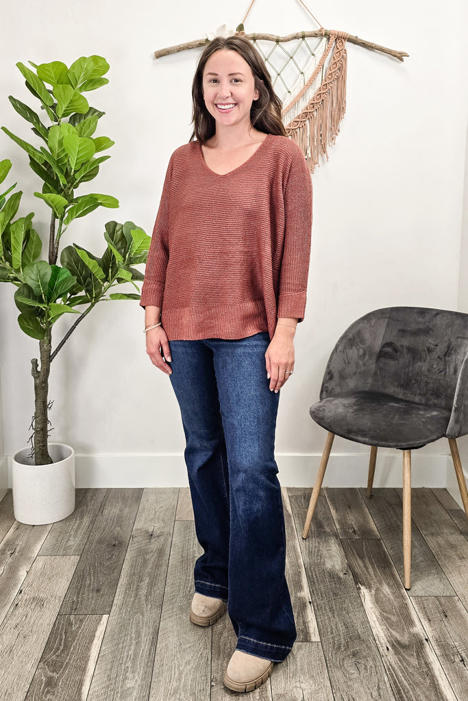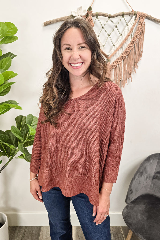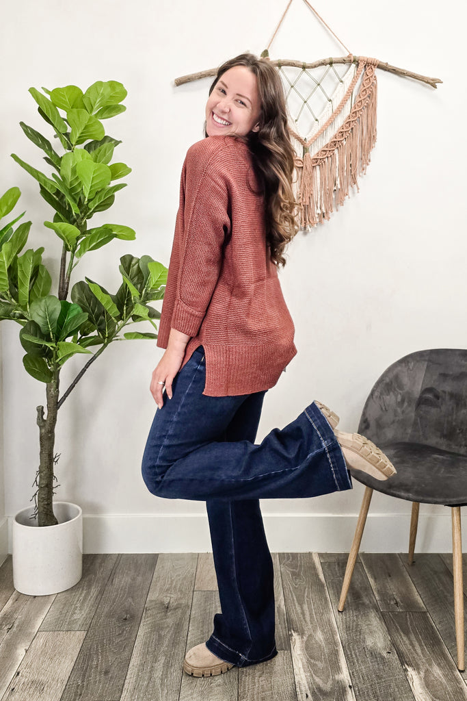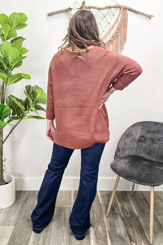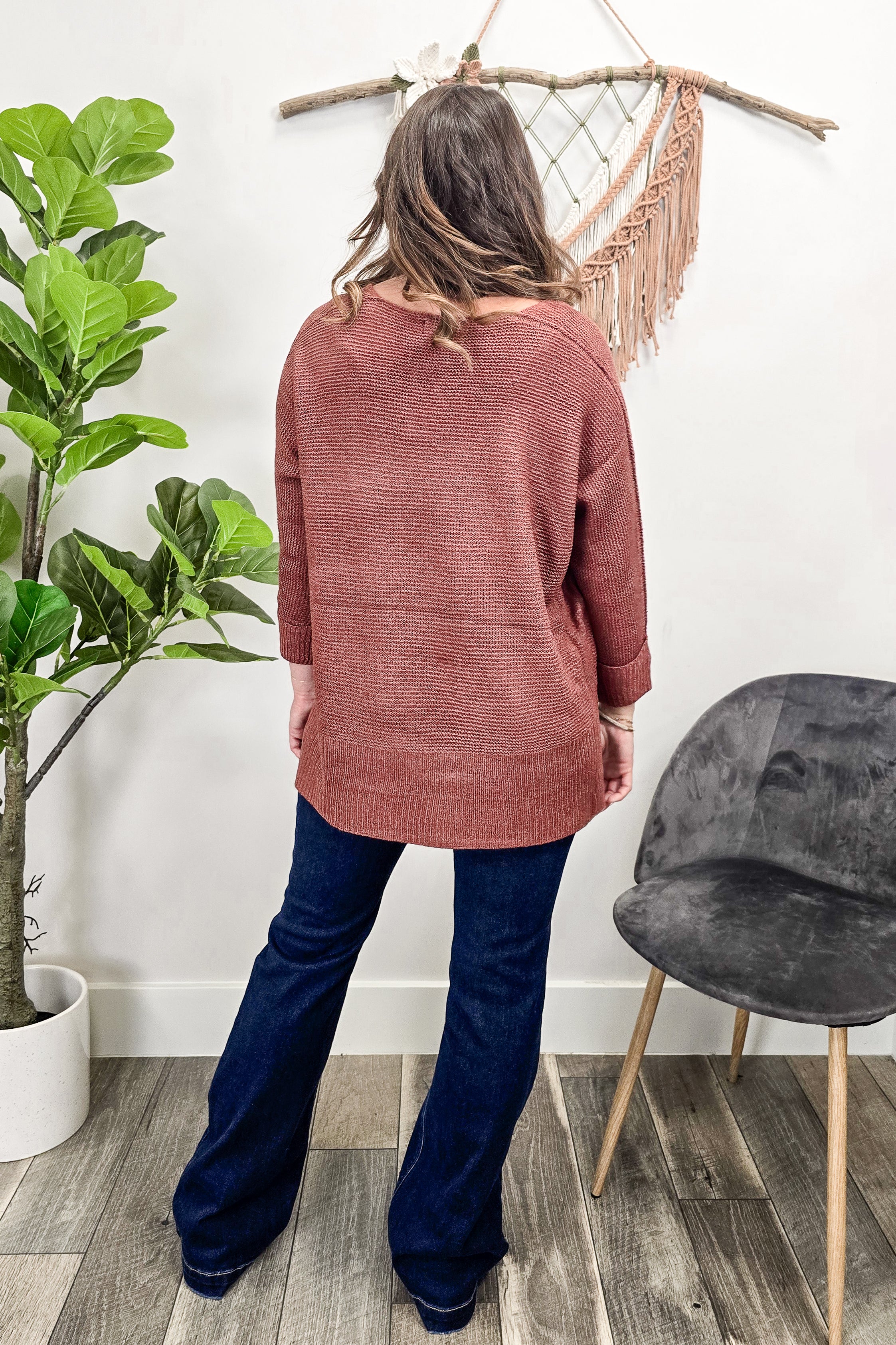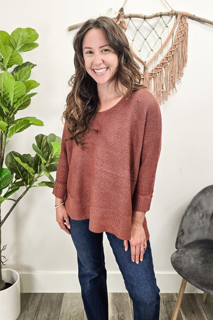 This sweater is slouchy in all the right ways. With its dolman sleeves, rolled cuffs, and high-low hem, it’s built for cozy mornings, casual errands, and everything in between. The soft knit drapes beautifully, and the side slits give it that easy, effortless vibe you love.
