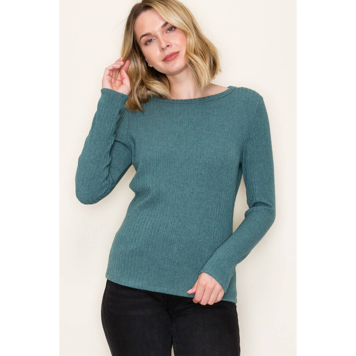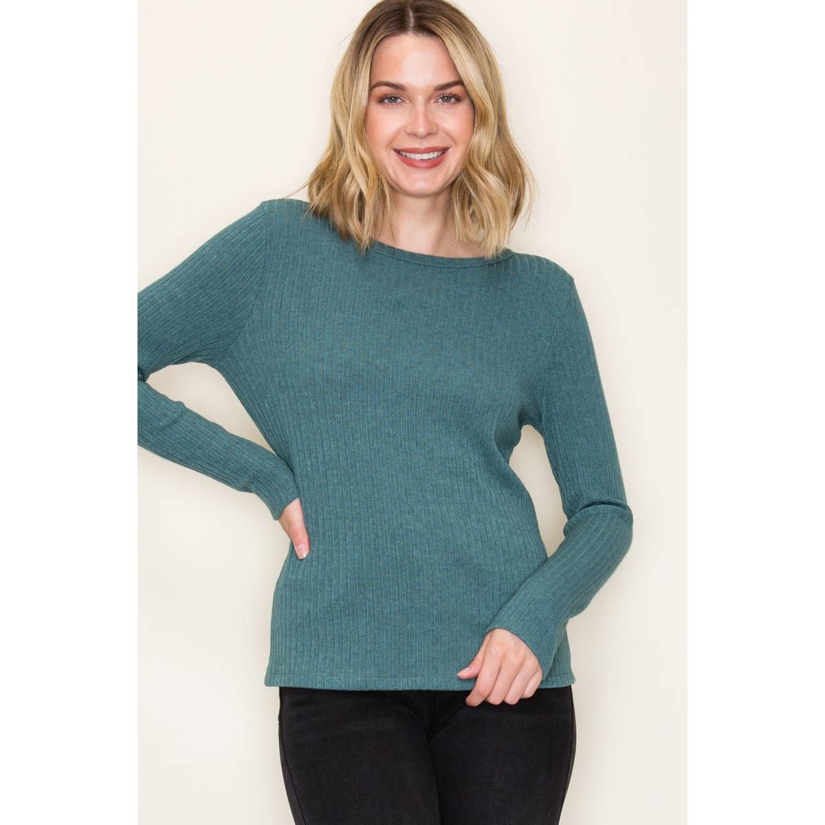 Cozy and effortlessly chic, this pullover top is the perfect blend of comfort and style. Crafted in a soft hacci ribbed knit, it features a relaxed silhouette with long sleeves and a classic crew neckline. The heavier weight fabric makes it ideal for cooler days, while the ribbed texture adds subtle detail that elevates the everyday look.