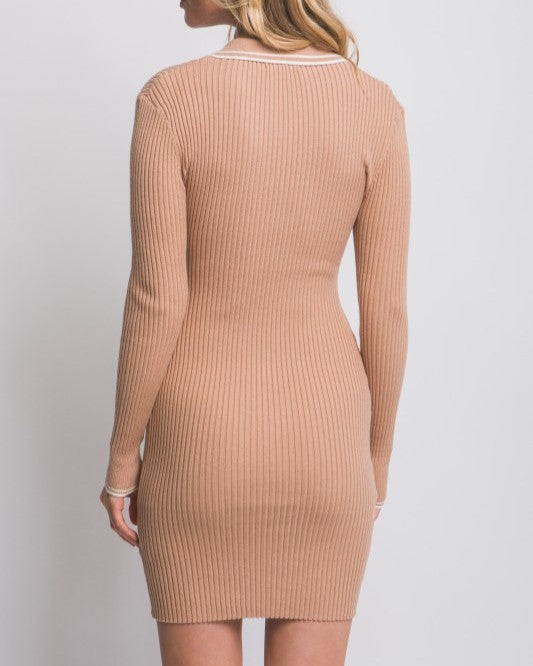 This LT Ribbed Midi Polo Sweater Dress combines elegant tailoring with comfort. Featuring a refined collared V neckline accented with crisp white trim, it offers a flattering, fitted silhouette that gently embraces your figure. The long sleeves and soft, highly stretchy fabric ensure ease of movement while maintaining a polished, sophisticated look—perfect for day-to-night wear.